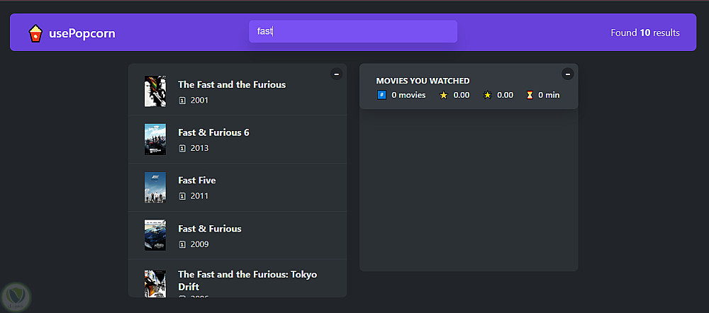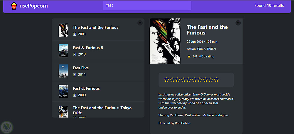 تطبيق ويب تفاعلي "Use Popcorn" لإدارة الأفلام المشاهدة/المرغوبة. يتيح البحث (OMDb API)، عرض التفاصيل، التقييم، والإضافة لقائمة المشاهدة مع إحصائيات (متوسط التقييم، مدة المشاهدة).
