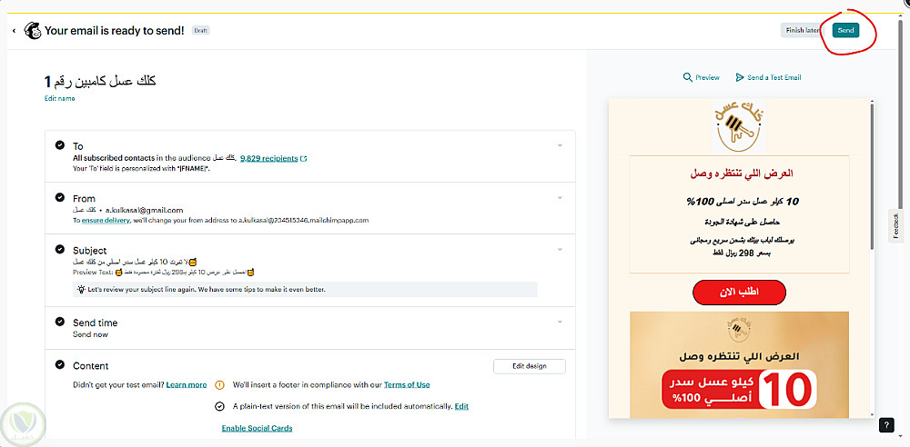"تصميم حملة بريد إلكتروني لويبسايت كلك عسل باستخدام MailChimp"