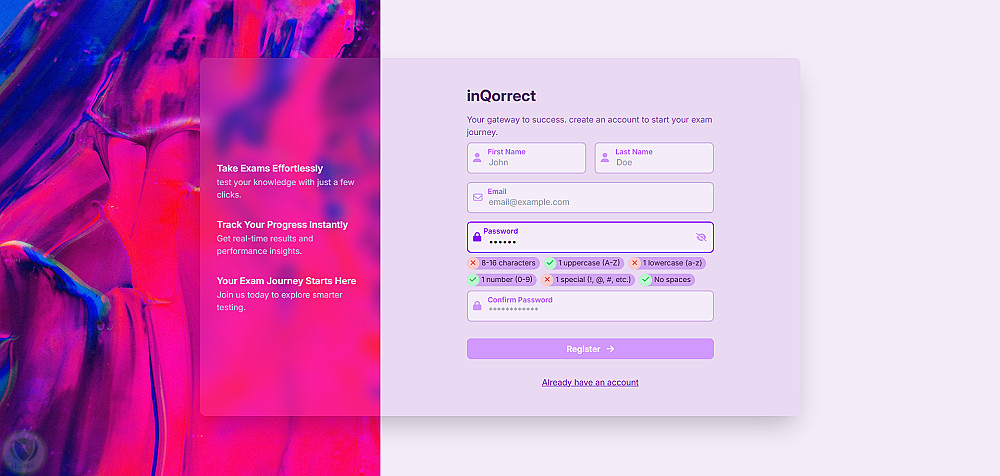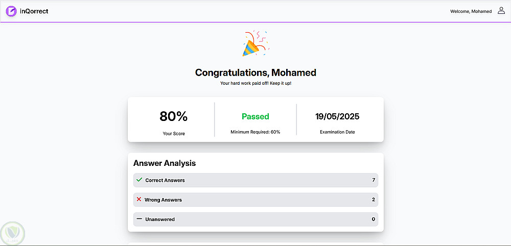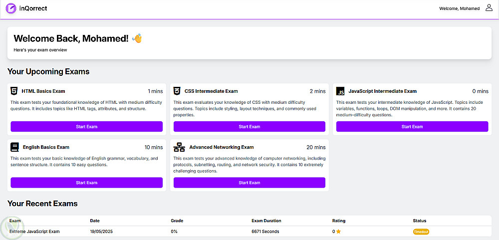 قمت بتطوير منصة اختبارات عبر الويب باسم inQorrect، تتيح للمستخدمين التسجيل، أداء الامتحانات، والحصول على نتيجتهم بشكل فوري.