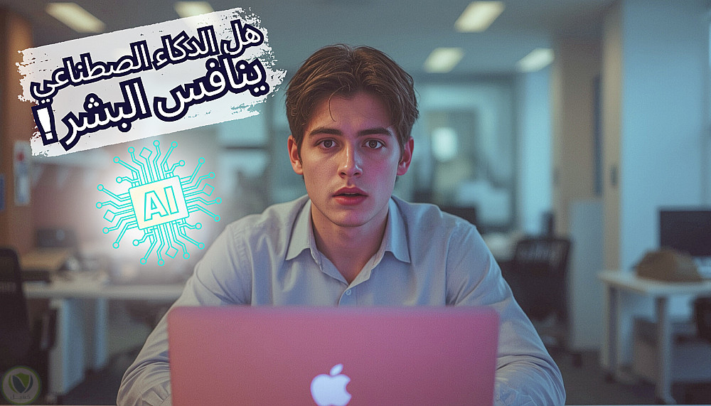 رجل شاب، ذو بشرة بيضاء، وعمر يتراوح بين 18 و 25 عامًا، يجلس أمام حاسوب محمول وردي اللون. يواجه المشاهد مباشرةً. يبدو منزعجًا أو مندهشًا قليلاً، مع تعبير واضح على وجهه. يضع الرجل قميصًا أزرق فاتحًا. يقع الحاسوب المحمول في المنتصف تقريبًا من الإطار. الخلفية غامضة وبوضوح أقل بكثير من الشخص في الصورة. يبدو المكان وكأنه مكتب أو مساحة عمل، مع بعض المكاتب والأثاث الأخرى في الخلفية. اللون العام هو هادئ، مع نغمة بنية مائلة للوردي تسيطر على الصورة. يوجد رمز "AI" على الصورة ويظهر على شكل رمز رقمي في وسط الصورة. وضوح التركيز واضح على الشخص وعلى الوجه تحديداً. يُظهر الإطار منظورًا من الأعلى قليلاً، مما يضيف إلى جودة التصوير.