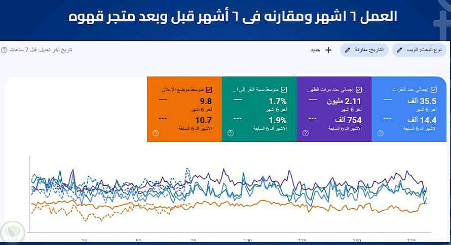 تم تنفيذ استراتيجية تحسين محركات البحث (SEO) لمتجر إلكتروني متخصص في القهوة لمدة 6 أشهر، مع مقارنة الأداء الرقمي بالفترة التي سبقتها لقياس النتائج.