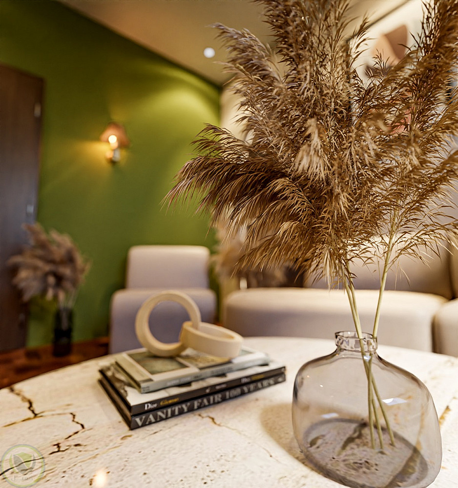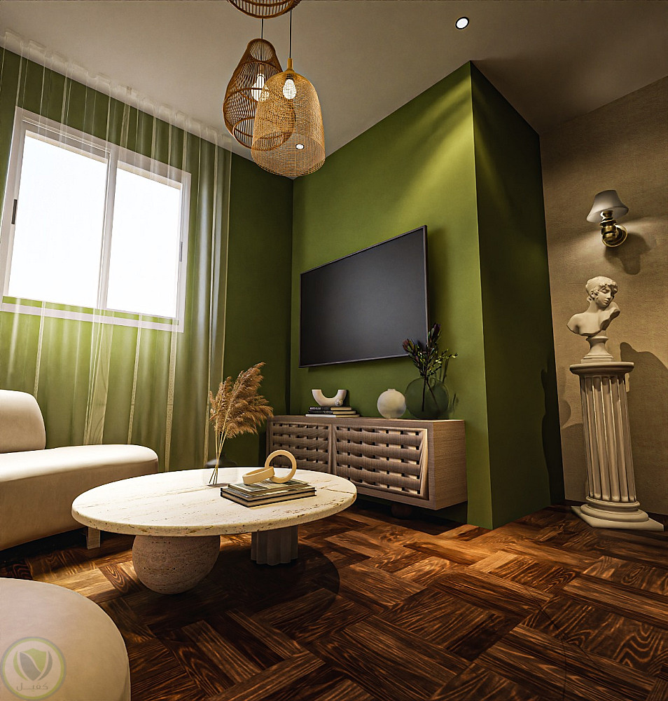 تم اختيار خامات محاكية للواقع، مع إضاءة ناعمة تبرز عناصر التصميم وتضفي لمسة دافئة على المساحة.