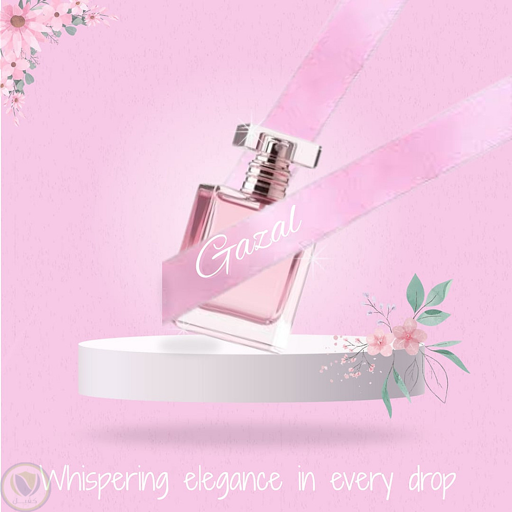 تصميم إعلان لعطر نسائي راقٍ يحمل اسم "غزل".