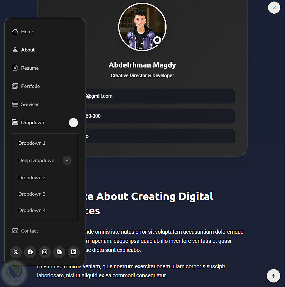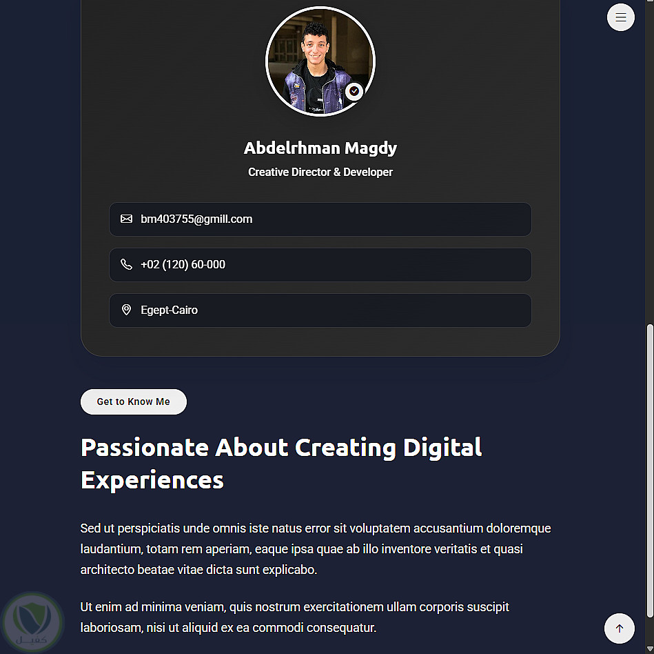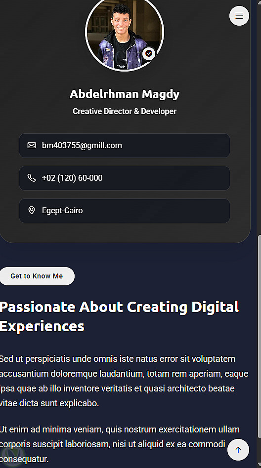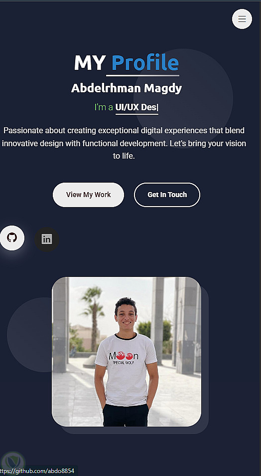 هذا العمل هو عبارة عن صفحة بروفايل شخصية تم تصميمها وتطويرها من الصفر باستخدام HTML وCSS وJavaScript، بهدف تقديم نبذة احترافية عني كمطور واجهات أمامية.