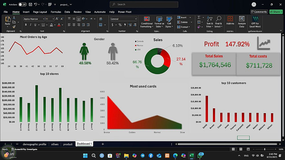 الصورة تُظهر لوحة معلومات (Dashboard) مصممة في برنامج مايكروسوفت إكسل لتحليل بيانات المبيعات. اللوحة مقسمة بشكل واضح لتوفير نظرة سريعة وشاملة على أداء الشركة. في الجزء العلوي، يمكن رؤية رسوم بيانية توضح توزيع الطلبات حسب العمر والجنس، بالإضافة إلى أرقام مهمة مثل إجمالي المبيعات، التكاليف، والربح.