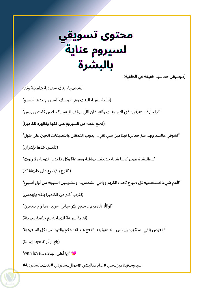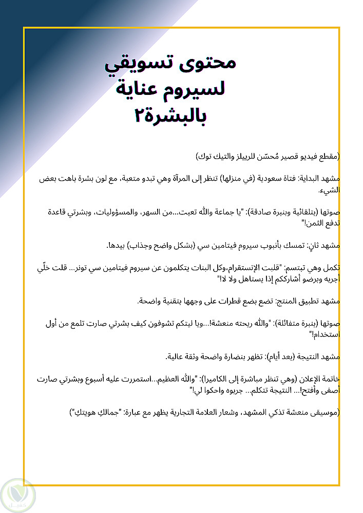 1. واقعي وليس مثالي: يبدأ بمشكلة حقيقية (الإرهاق، البشرة الباهتة) مما يخلق تعاطفًا فوريًا.