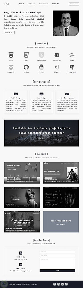 قمت بتصميم وتطوير موقع بورتفوليو شخصي متكامل باستخدام React.js للواجهة الأمامية وPython/Django للواجهة الخلفية، بهدف عرض الأعمال والخدمات بطريقة احترافية وجذابة.