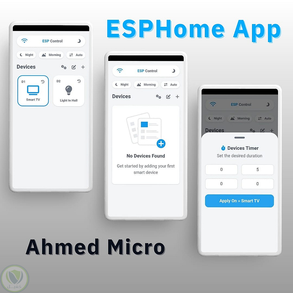 تم تصميم واجهة مستخدم احترافية لتطبيق ESPHome للتحكم بالأجهزة الذكية داخل المنزل.