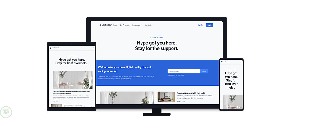 هيدر (Header) يحتوي على شعار، روابط أساسية (Home, Products, Resources, Contacts) وأزرار تسجيل الدخول/إنشاء حساب.
