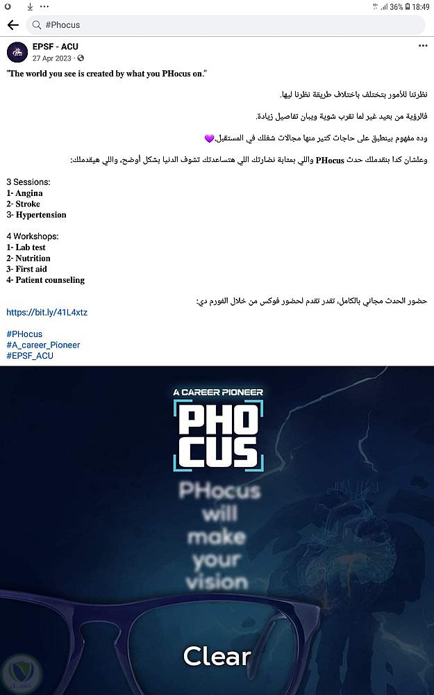 اعلان لمؤتمر عن السرطان لطلبة الصيدلة ،تشبيه للمؤتمر بالنظارة التى توضح الرؤية