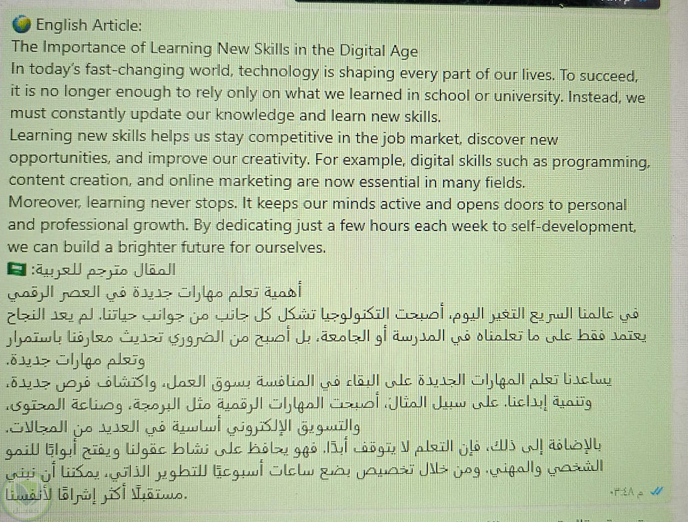 ترجمة مقال قصير من اللغة الإنجليزية إلى اللغة العربية، ترجمة دقيقة واحترافية تراعي المعنى والأسلوب، مع الحفاظ على وضوح النص وسهولة قراءته. هذا نموذج عملي يوضح جودة الترجمة التي أقدمها للعملاء.