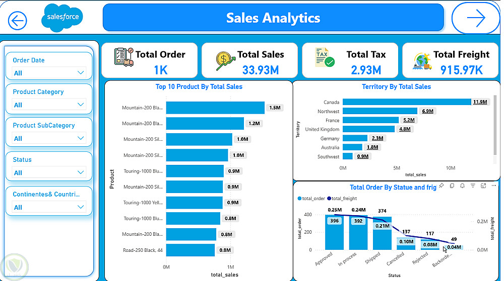 تحليل المنتجات الأكثر مبيعًا، أداء المناطق الجغرافية، وحالة الطلبات.