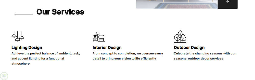 قمت بتصميم موقع عرض خدمات التصميم الداخلي لعميل يقدّم خدمات داخلية، الخارجية، وتصميم الإضاءة.