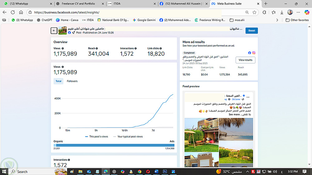ادارة صفحة متخصصة لعرض الوحدات السياحية الايجارية لأحد اكبر القرى السياحية في منطقة العين السخنة، مهمتي تبدأ من مراجعة المحتوى والمنشورات قبل النشر وتحسينها لتلائم الفئة المستهدفة، تعديل الصور، جدولة المنشورات، متابعة الاعلانات ومتابعة تعليقات العملاء على الاعلانات والتواصل معهم وتأكيد الحجز، التواصل مع باقي أعضاء الفريق لتأكيد عمليات الحجز ضمن أجندة العمل ومتابعة العميل منذ لحظة الدخول وحتى تسجيل الخروج