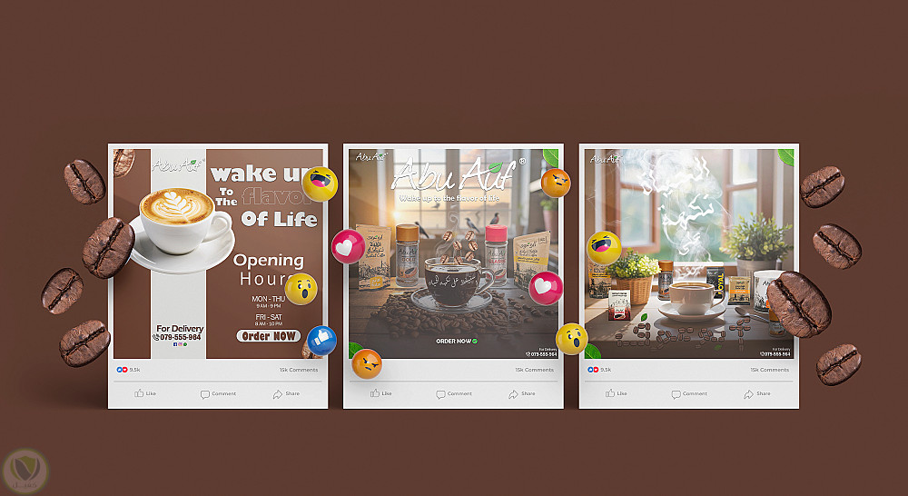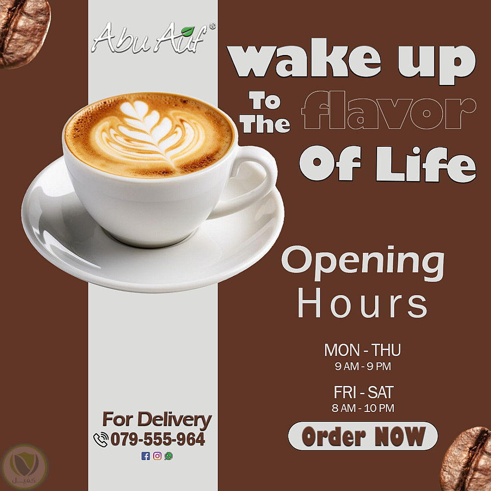يظهر فنجان القهوة في قلب المشهد، يتصاعد منه البخار بخطوط ناعمة تُكوّن شكل شعار "أبو عوف"، في إشارة ذكية إلى أن كل رشفة تحمل بصمة العلامة.