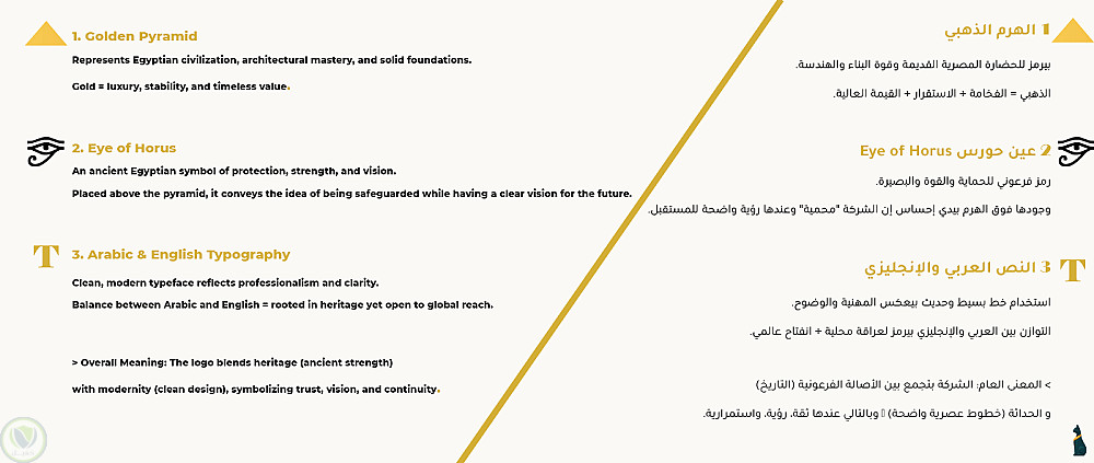 الألوان تم اختيارها بعناية لتجسّد القوة، المصداقية، والتميز — الذهبي يرمز للجودة والريادة، والأسود يعبّر عن الثبات والهيبة، بينما الأبيض يمنح توازنًا بصريًا يوحي بالثقة والنقاء.