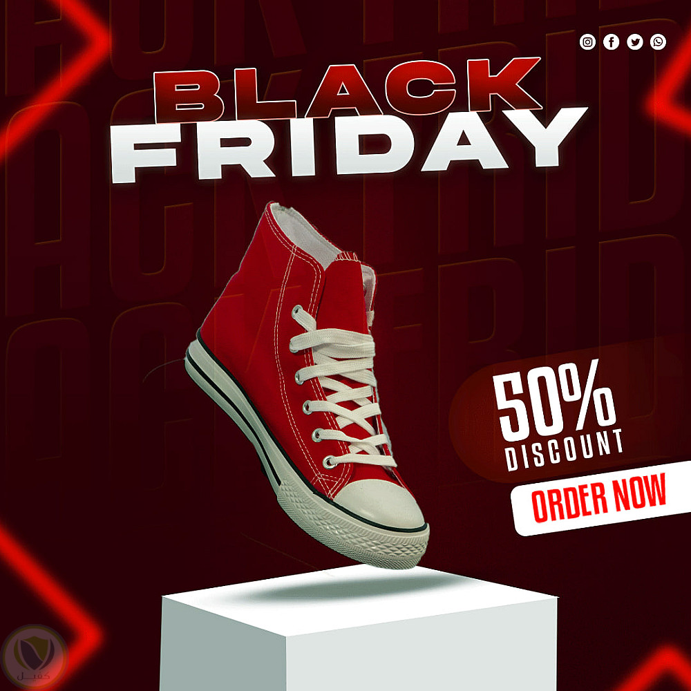 في التصميم ده ركّزت على فكرة العرض القوي (Black Friday)، فاخترت ألوان غامقة وحارة (أسود، أحمر، أبيض) علشان تعبر عن القوة، الإثارة، والعروض الكبيرة.