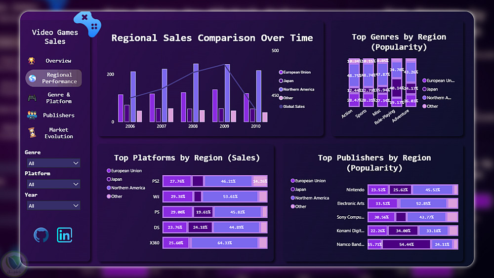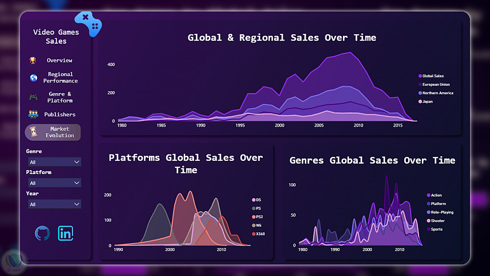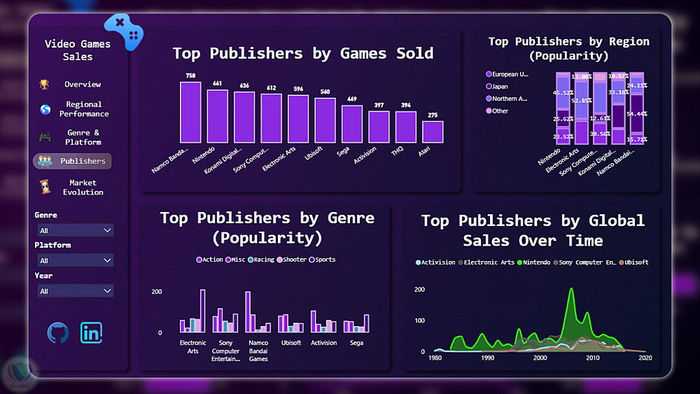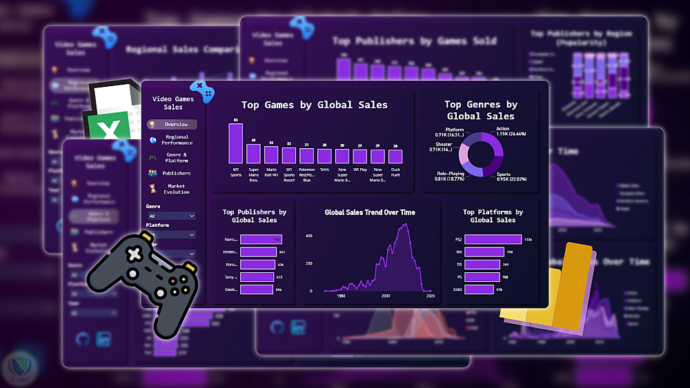 مشروع متكامل لتحليل بيانات مبيعات ألعاب الفيديو العالمية، بهدف تحويل البيانات الخام إلى لوحة معلومات تفاعلية تكشف الأنماط وتوجهات السوق بطريقة سهلة وواضحة.