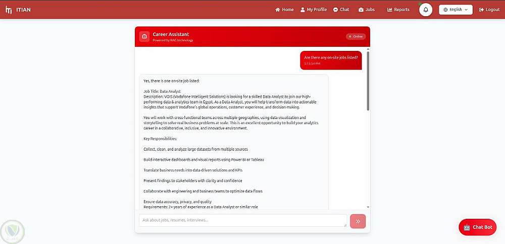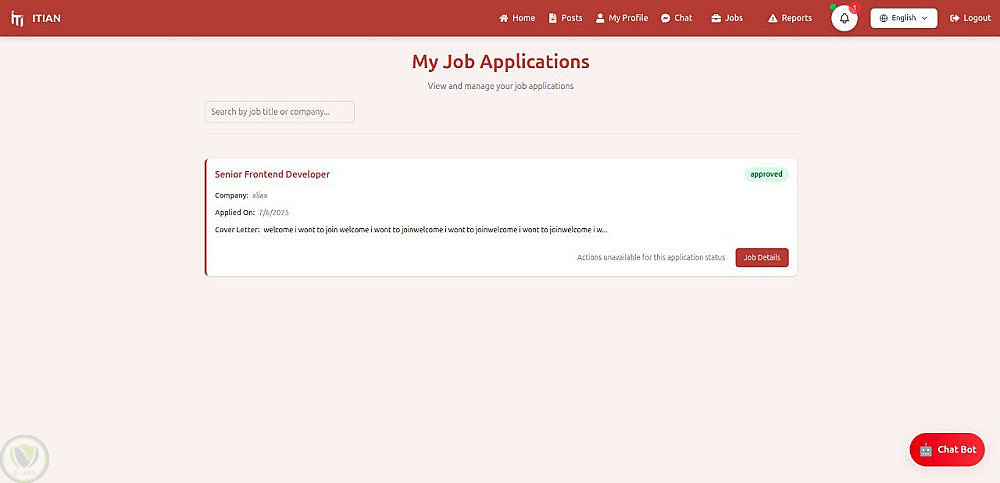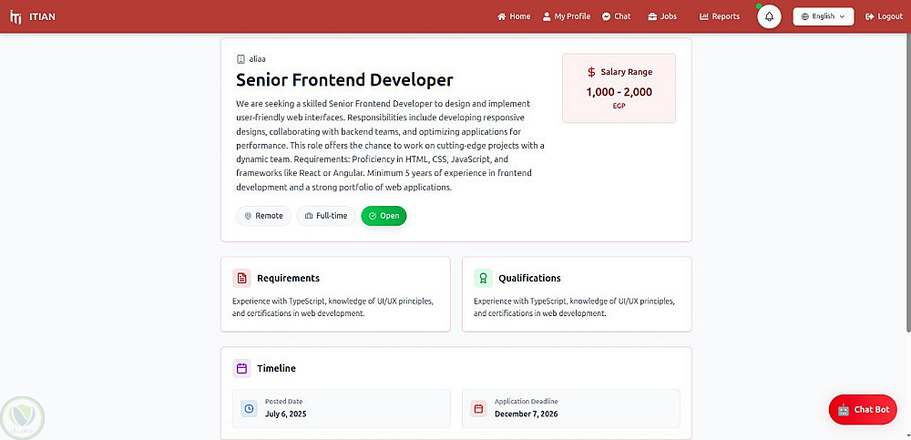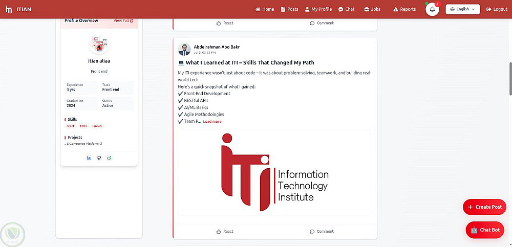 منصة مجتمعية متكاملة تربط بين خريجي معهد تكنولوجيا المعلومات (ITI) وأصحاب العمل، طُوّرت ضمن برنامج التدريب الاحترافي (9 أشهر – تراك الأوبن سورس بفرع المنيا). تهدف إلى تسهيل التواصل بين الخريجين والشركات من خلال شبكة اجتماعية تفاعلية تضم منشورات، بروفايلات احترافية، نظام شات لحظي، وإشعارات فورية.