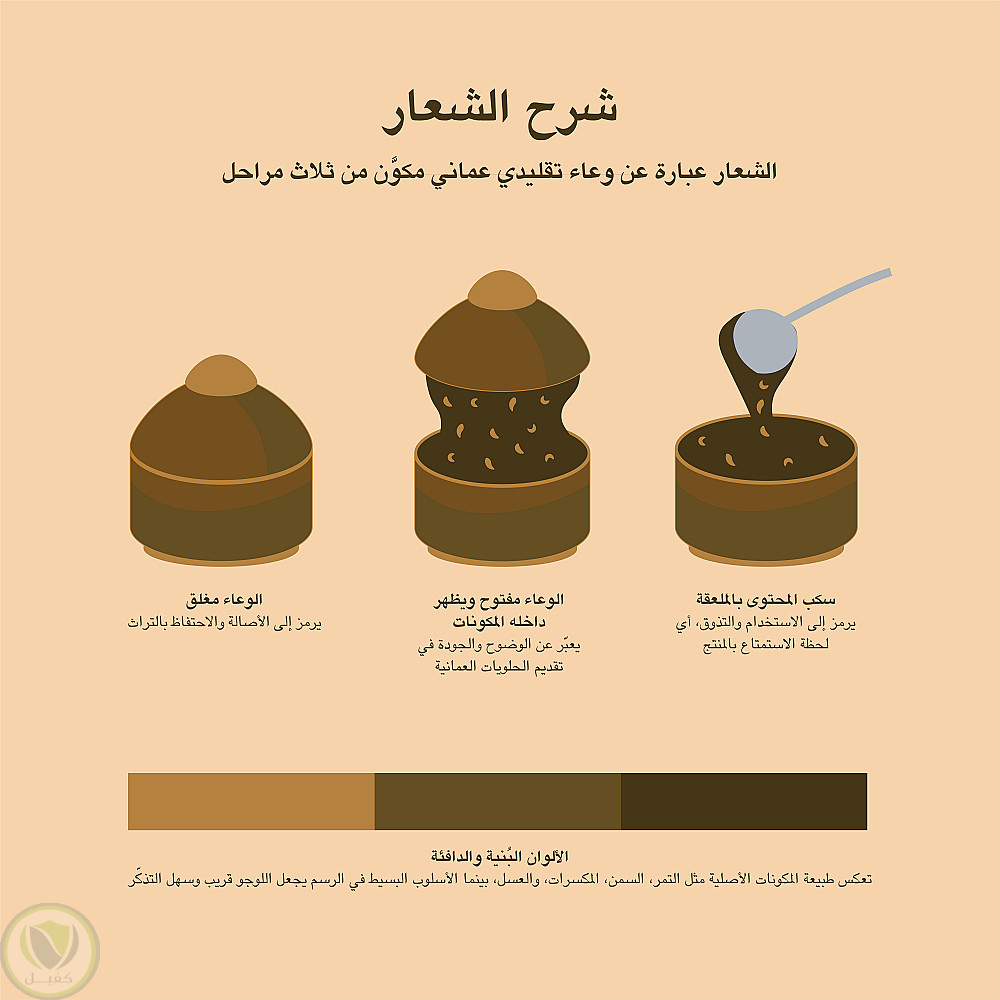 الشعار عبارة عن وعاء تقليدي عُماني مرسوم بأسلوب بسيط وأنيق، بيعبر عن الأصالة والوضوح في تقديم الحلويات العُمانية.