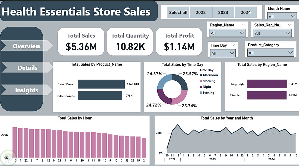 تُقدم لوحة المعلومات هذه تحليلاً شاملاً لأداء مبيعات متجرٍ للمستلزمات الصحية، مع تسليط الضوء على أهم الاتجاهات وتقديم رؤى عملية. كما تُمكّن من اتخاذ قراراتٍ مبنية على البيانات من خلال تقديم توصياتٍ مُستهدفة، مثل زيادة جهود التسويق خلال ساعات الذروة وإعطاء الأولوية للمنتجات عالية الربحية.