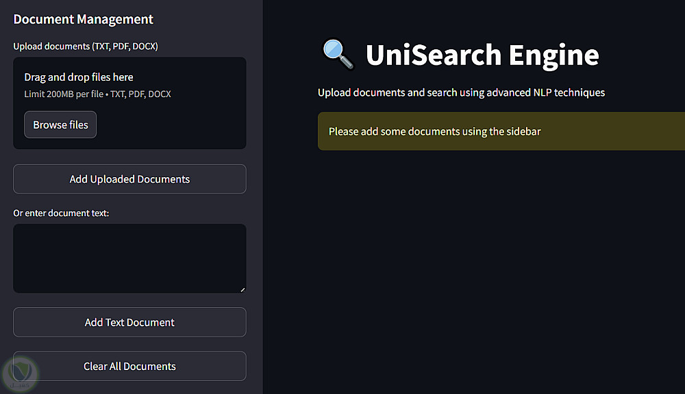 محرك البحث UniSearch هو نظام استرجاع مستندات قائم على لغة بايثون، ويستخدم تقنيات معالجة اللغة الطبيعية (NLP) وتصنيف TF-IDF للعثور بسرعة على المعلومات ذات الصلة في ملفات TXT وPDF وDOCX. تتميز واجهته Streamlit سهلة الاستخدام بتمييز المصطلحات، ومعاينات المستندات، وعتبة تشابه قابلة للتعديل. كما يتضمن النظام آلية تقييم / لتقييم مدى ملاءمة النتائج، مما يضمن تجربة بحث دقيقة وتفاعلية.