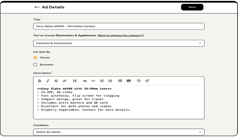 إمكانية إضافة الإعلانات مع عدد لا محدود من الصور ووصف تفصيلي شامل