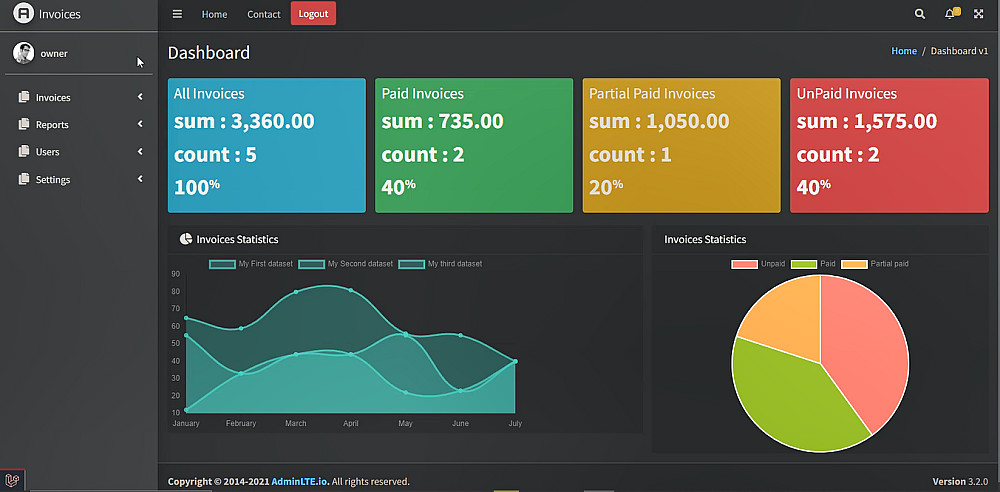 نظام فواتير يشمل واجهة تسجيل دخول، لوحة تحكم، صفحة الفواتير، التقارير وإدارة المستخدمين.