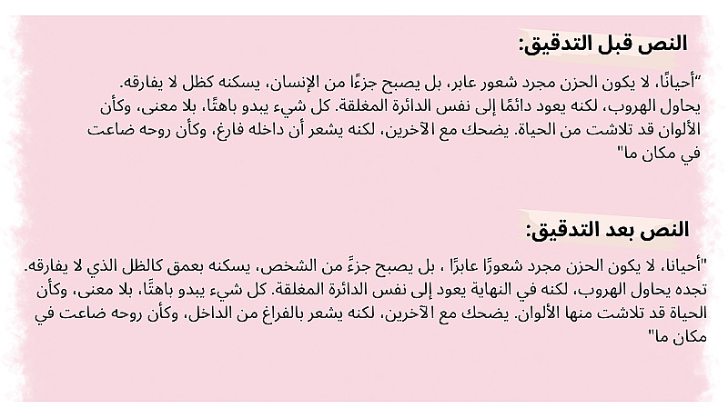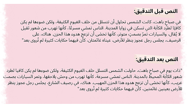 • تحسين الصياغة دون تغيير الأسلوب الأدبي أو الإخلال ب نغمة النص.