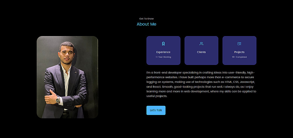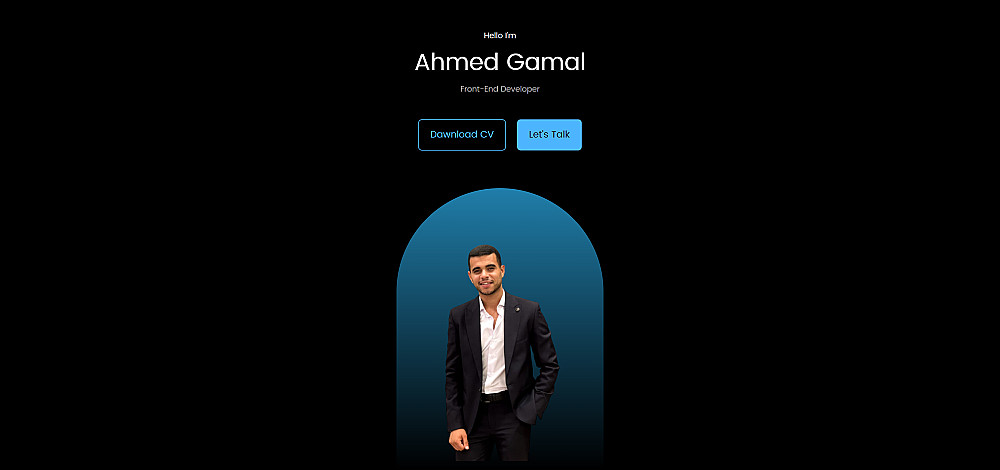أنا أحمد جمال، مطور واجهات أمامية بخبرة واسعة، سأقوم بتصميم موقع بورتفوليو أنيق وسريع، متجاوب مع جميع الأجهزة، ويعكس شخصيتك وأسلوبك المهني.