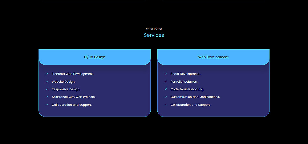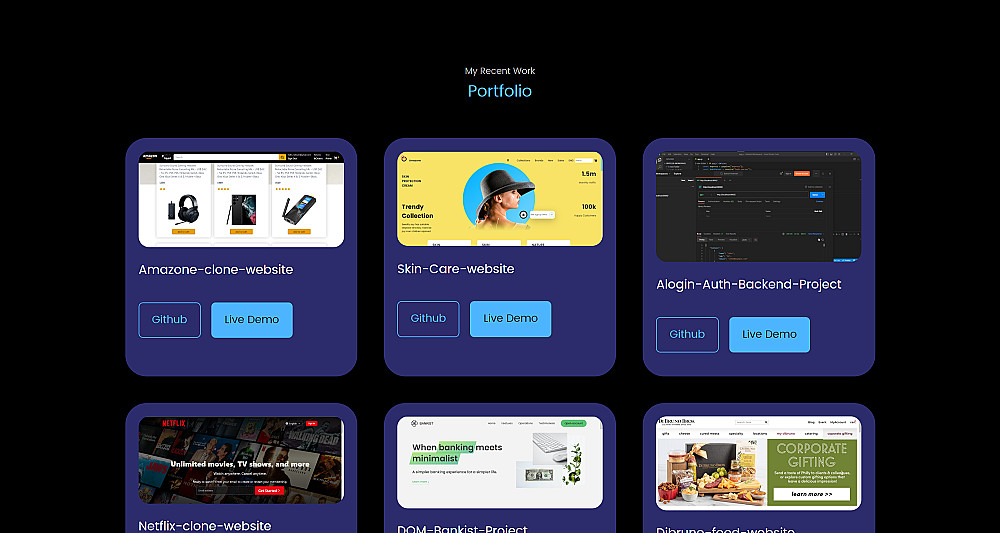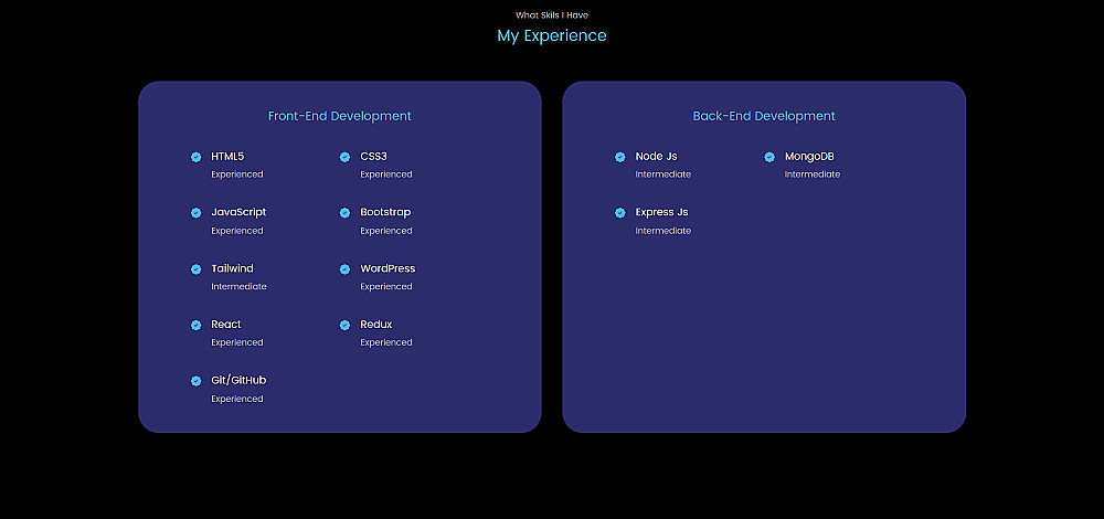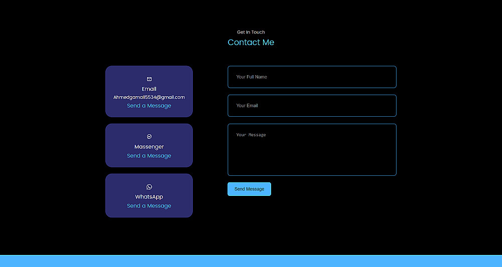 - موقع بورتفوليو شخصي مكون من أقسام مثل: (الرئيسية – من أنا – أعمالي – المهارات – تواصل معي)