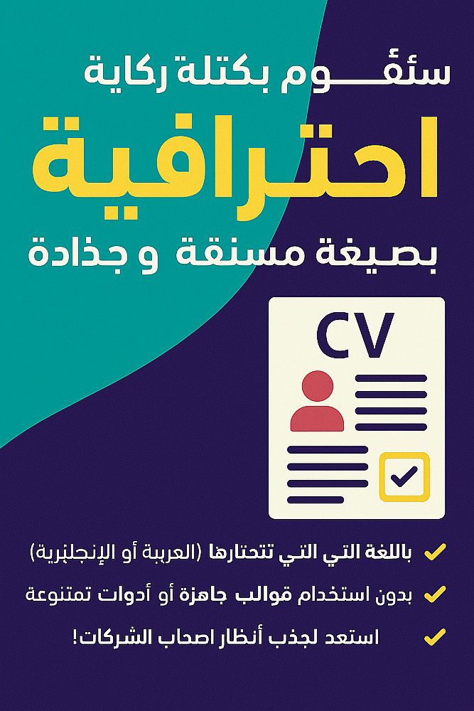 أقدّم لك خدمة كتابة سيرة ذاتية احترافية، بصياغة جذابة ومنظمة تبرز مهاراتك وخبراتك بأفضل شكل ممكن.