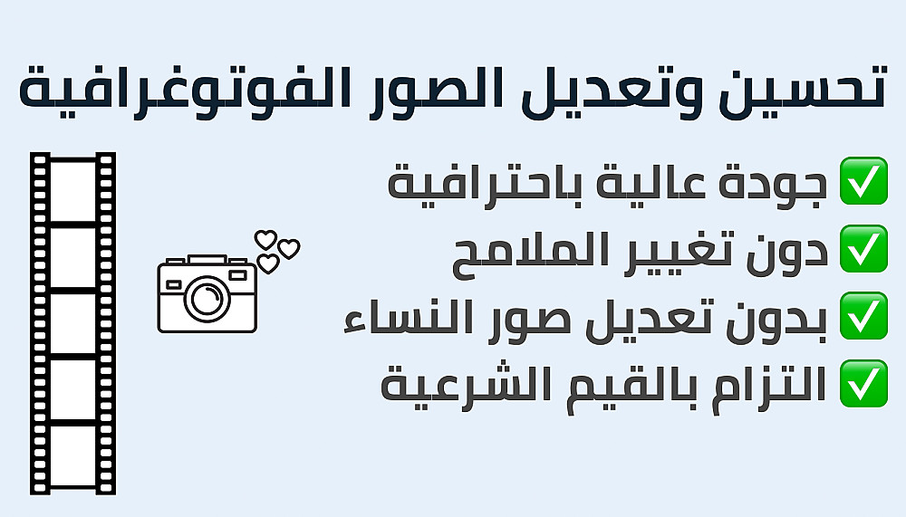 أقدّم لك خدمة تعديل وتحسين الصور الفوتوغرافية بجودة عالية مع الالتزام الكامل بالقيم الشرعية والأخلاقية.