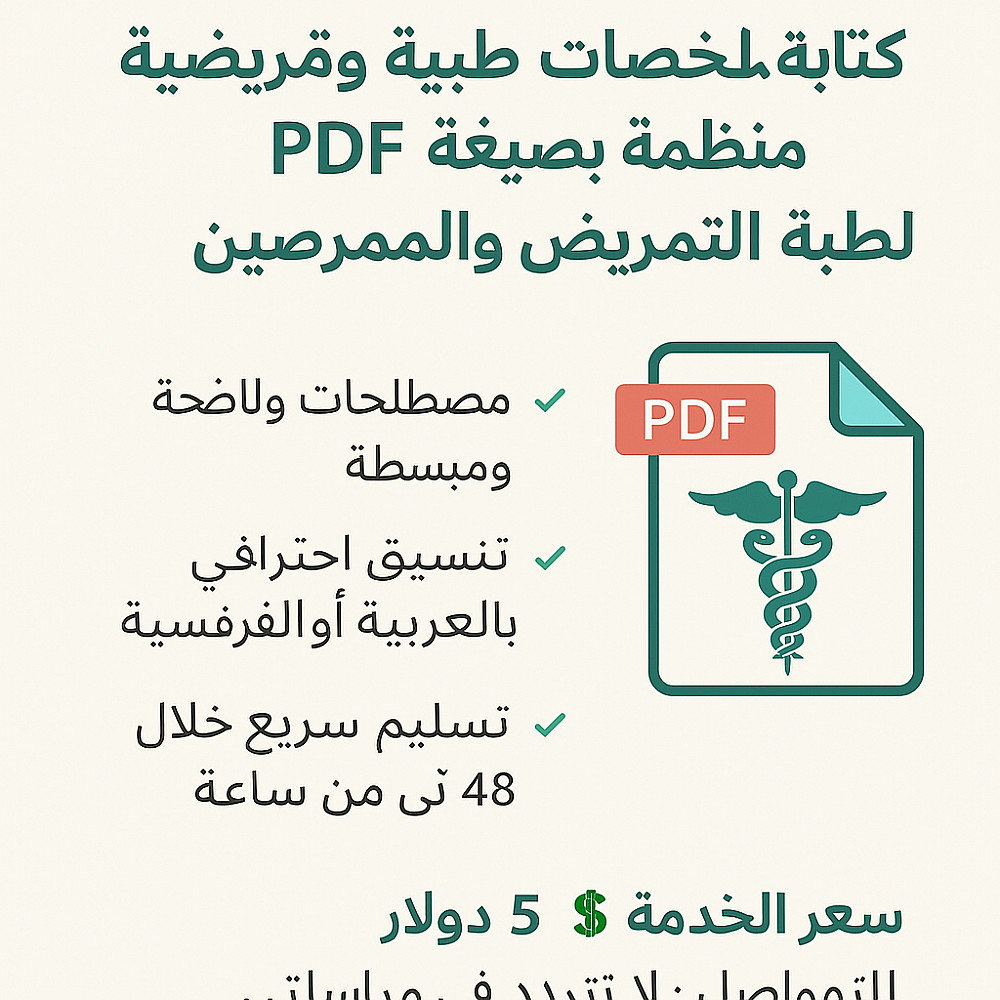 أقدّم لك خدمة كتابة وتنظيم ملخصات طبية أو تمريضية بصيغة PDF بطريقة احترافية ومنظمة، جاهزة للطباعة أو الدراسة.