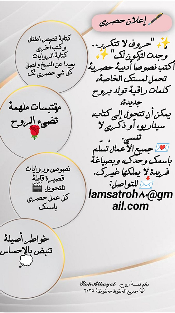 أقدم لك كتابة مقالات. أو خواطر مقتبسات حصرية وحتى قصص قصيرة وروايات قابلة للتنفيذ بشكل يليق بك وبأسلوب بسيط، جذاب، ومنسق.