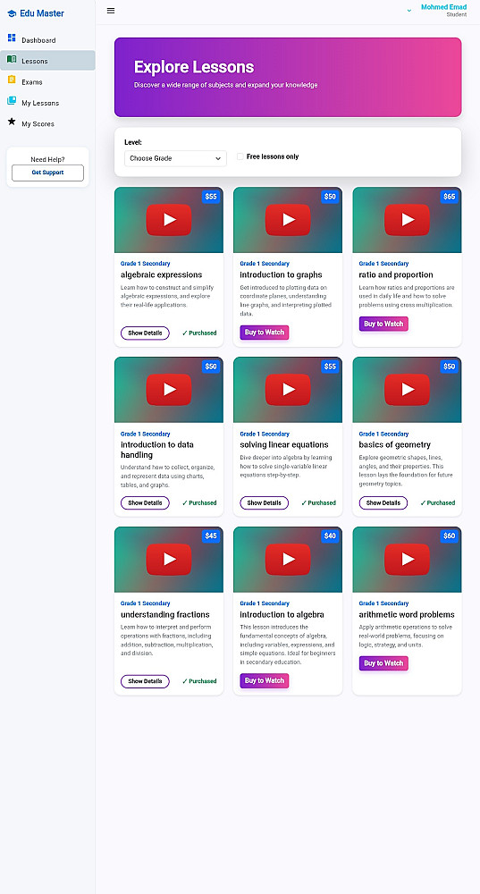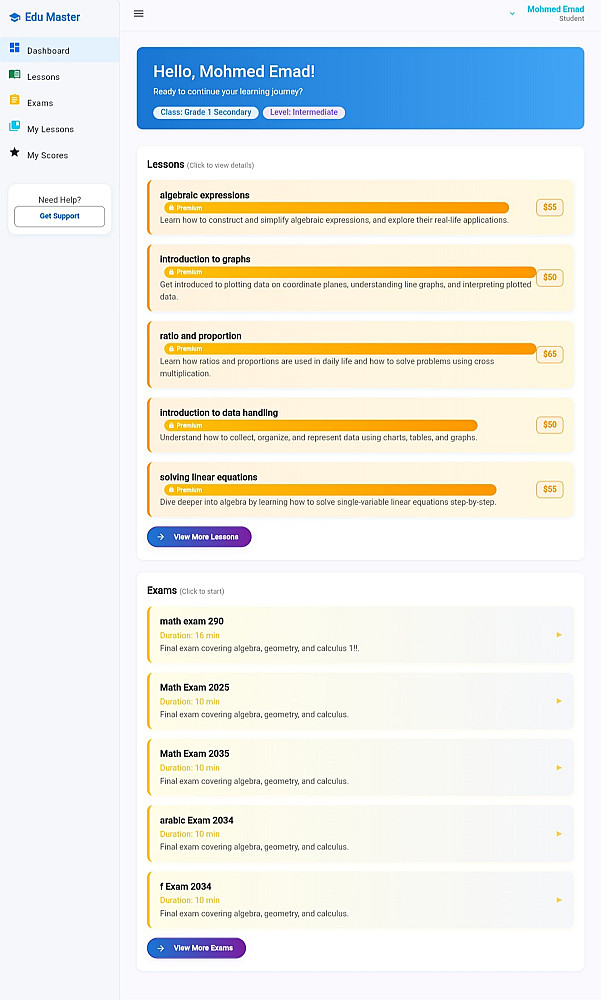 6.صفحة للطالب لعرض الدروس والاختبارات والنتائج.