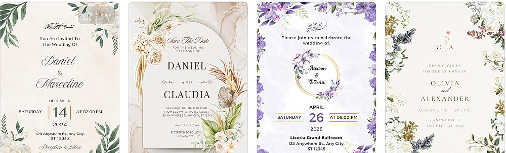 دعوات زفاف مصممة خصيصًا لتعبّر عن أناقة ورقي مناسبتكم. أقدم لكم خدمة تصميم دعوات زفاف تجمع بين الأصالة والحداثة، وتناسب جميع الأذواق والميزانيات.