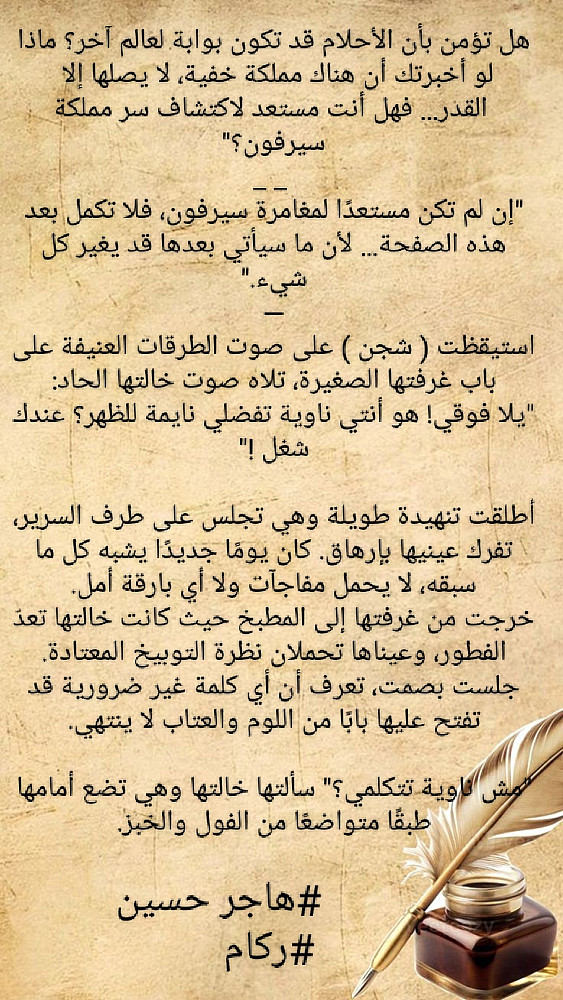أنا [هاجر حسين/ركام]، كاتبة وخبيرة في فنون السرد القصصي والروائي لأكثر من 3 سنوات. إذا كنتِ تبحثين عن عمل أدبي حقيقي يلامس القلوب، أو تحتاجين إلى لمسة احترافية تحوّل فكرتك إلى نص خالد، فأنتِ في المكان الصحيح.