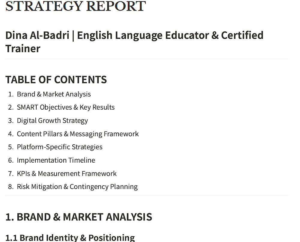 1.الدمج الاستراتيجي: لا أقدم خطة منفصلة عن التنفيذ. الاستراتيجية مصممة خصيصاً لتكون قابلة للتطبيق الفوري باستخدام أدوات الذكاء الاصطناعي.