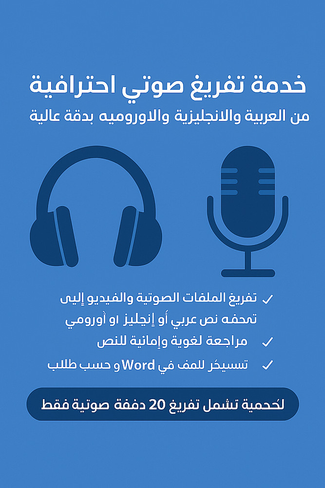 أقدم خدمة التفريغ الصوتي والفيديو بدقة عالية وخالية من الأخطاء، مع تنسيق كامل وتسليم احترافي وسريع.
