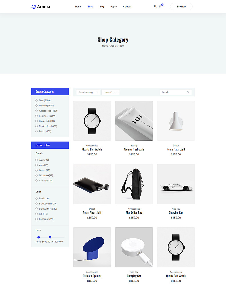 صفحة المتجر (Shop Category): تصميم واجهة عرض المنتجات مع شريط مدى الأسعار (Price Slider) و فلتر الماركات (Filters) .