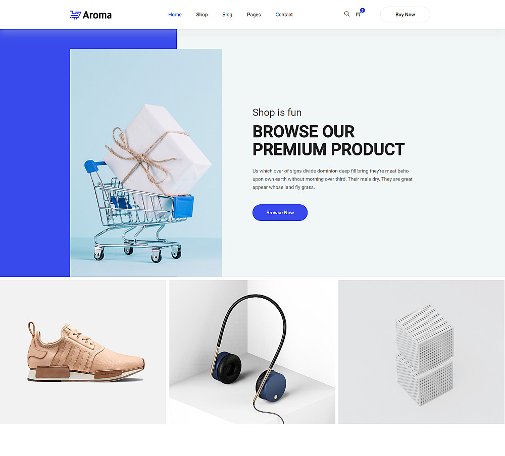 عناصر عامة: بناء شريط تنقل علوي (Navbar) متكامل يشمل أيقونات البحث والسلة (Cart) وزر الشراء (Buy Now).