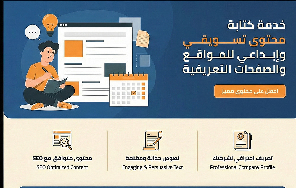 تشمل الخدمة كتابة محتوى صفحة واحدة أو أكثر حسب طلب العميل، مع تحديد نوع المحتوى حسب حاجتك، مثل محتوى الموقع (Home – About – Services – Portfolio – Contact)، محتوى تسويقي لصفحات الهبوط (Landing Page)، أو محتوى مخصص للسوشيال ميديا. يتم صياغة النصوص بشكل جذاب وسهل القراءة، مع مراعاة أسلوب الكتابة المناسب للغرض سواء كان تعريفي، تسويقي، أو تفاعلي.