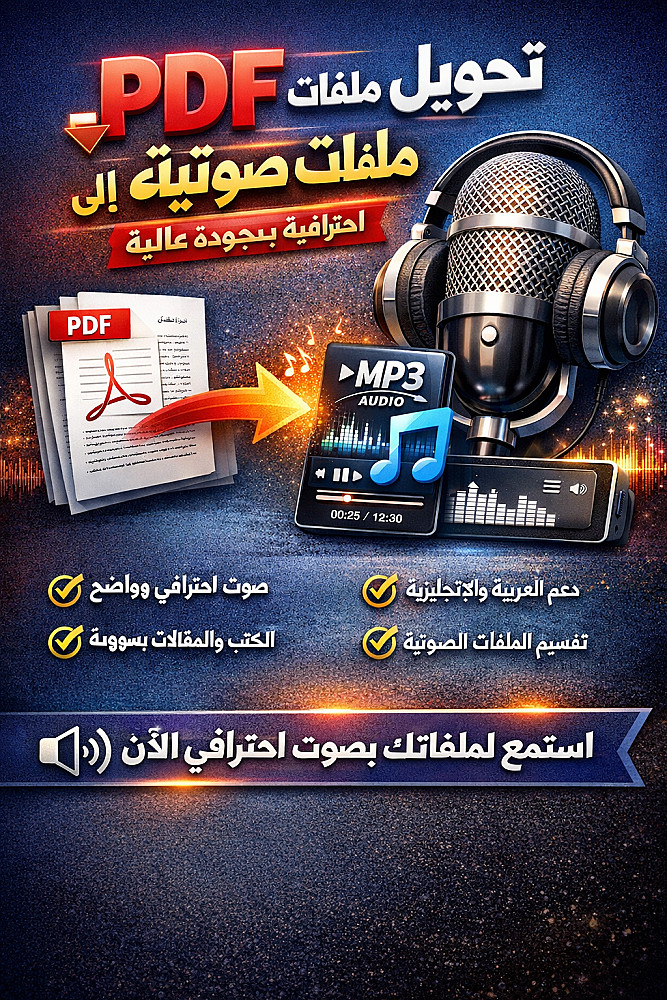 أقدّم لك خدمة تحويل ملفات PDF إلى Audio (MP3) بجودة ممتازة، مناسبة للكتب، المقالات، المذكرات، المحتوى التعليمي، أو أي نص تريد سماعه في أي وقت.