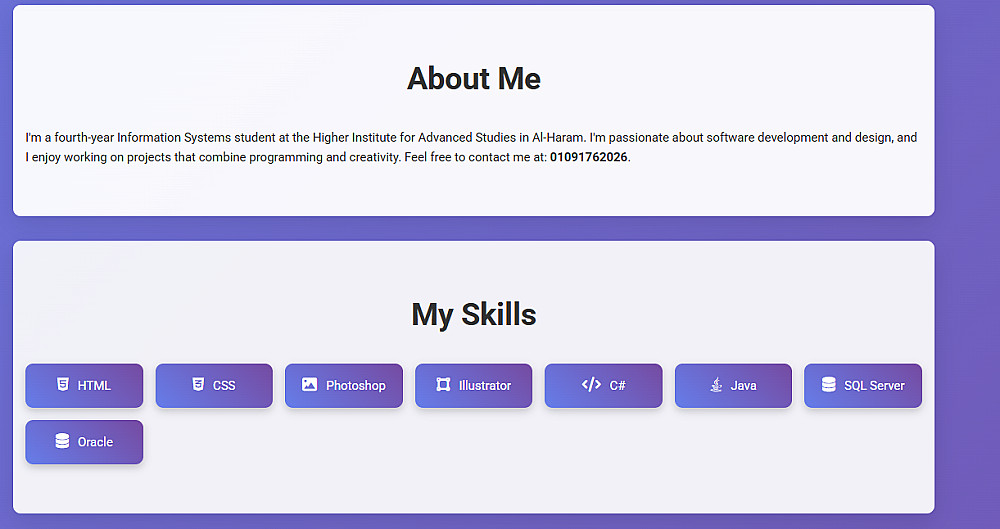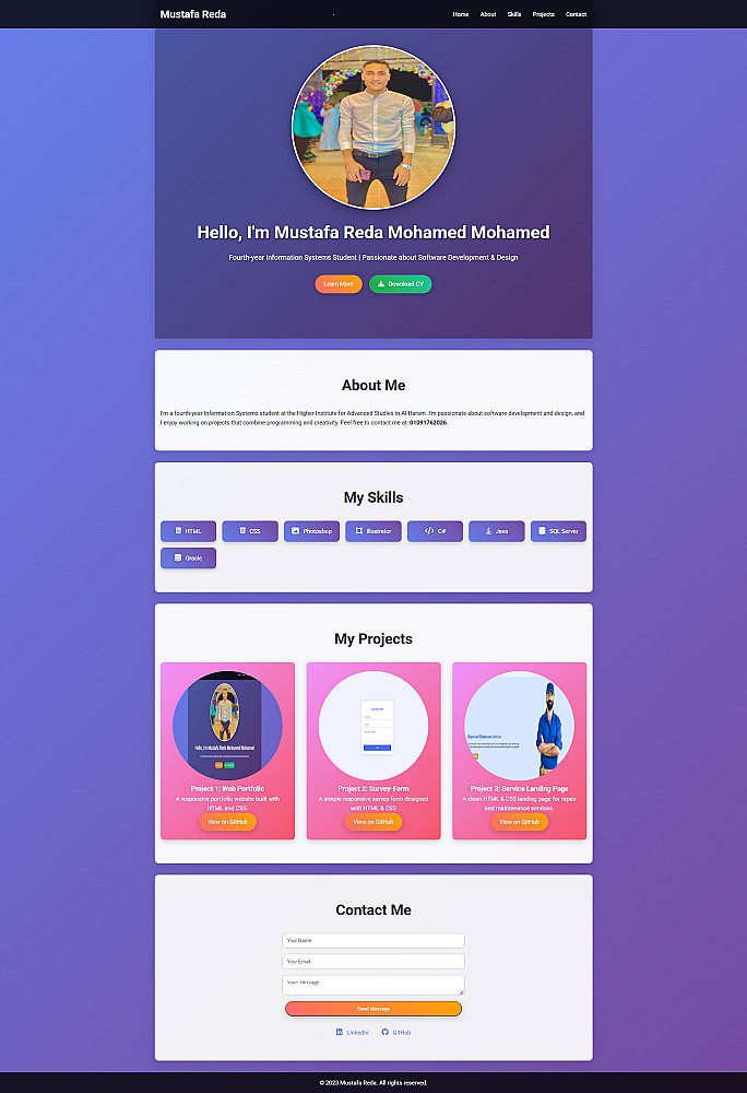 أقدّم خدمة تصميم وتطوير صفحة ويب شخصية (Portfolio Website) تعكس مهاراتك وخبراتك بشكل احترافي، وتساعدك على إبراز أعمالك وجذب فرص عمل أو عملاء جدد.