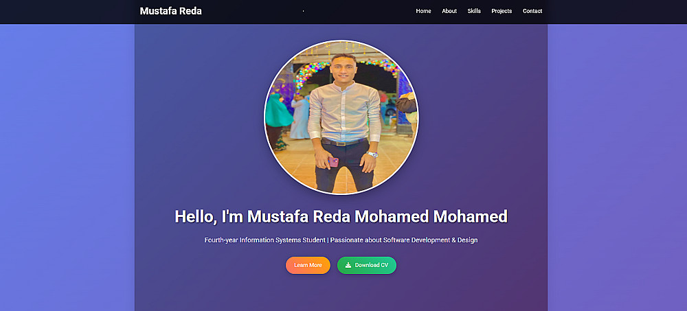 قسم تعريفي (Hero Section) بالاسم والصورة ونبذة مختصرة