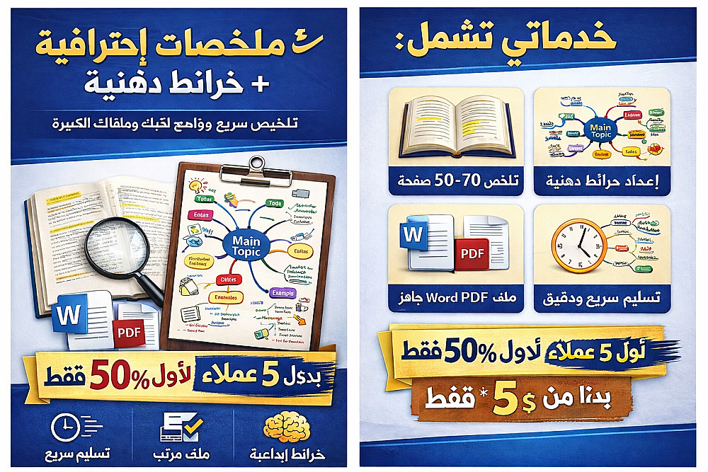 اقوم بتلخيص من 50 – 70 صفحة أو ما يعادل 500 – 700 كلمة لكل صفحة