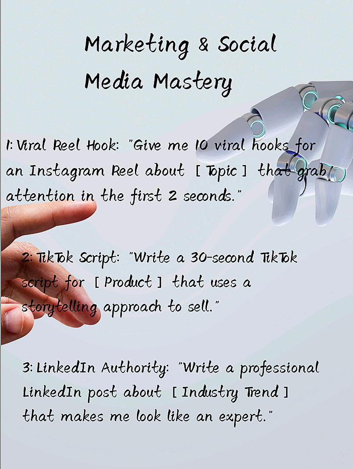 قسم التسويق: أوامر احترافية لكتابة سيناريوهات (TikTok) و (Instagram Reels) ومنشورات (LinkedIn) تجذب العملاء.