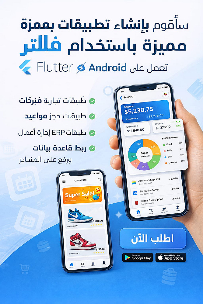 اقدم خدمه تطوير و انشاء التطبيقات باداء عالي و تصميم عصري و متجاوب يعمل على كل الاجهزة بواسطة flutter