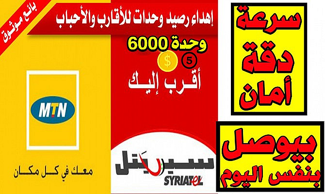 إذا كنت مغترب أو حتى داخل الأراضي السورية قم الآن بإهداء أهلك أو زوجتك أو معارفك أو أقربائك في سوريا رصيداً في هواتفهم النقالة لكل من شبكتي سيريتل وmtn في سورية , كل 6000 ليرة رصيد واصل ب 5 دولار للخطوط مسبقة الدفع و 6000 ليرة رصيد واصل للخطوط لاحقة الدفع.